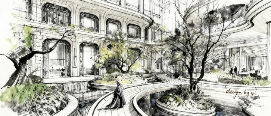 在建筑材料与视觉设计上,设计团队也充分汲取西西里元素:以岛屿海浪波纹为介质,主色调采用“优雅柔白色 + 仿铜金属色”,分别呼应西西里流动的水波与落日海面的鎏金质感,传递 “浓郁的慵懒Old Money风情”。